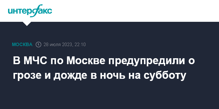 Москва. 28 июля. INTERFAX.RU - Дождь, гроза и усиление ветра с порывами до 15 м/с ожидаются в столице в субботу, сообщается на сайте главного управления МЧС по Москве.