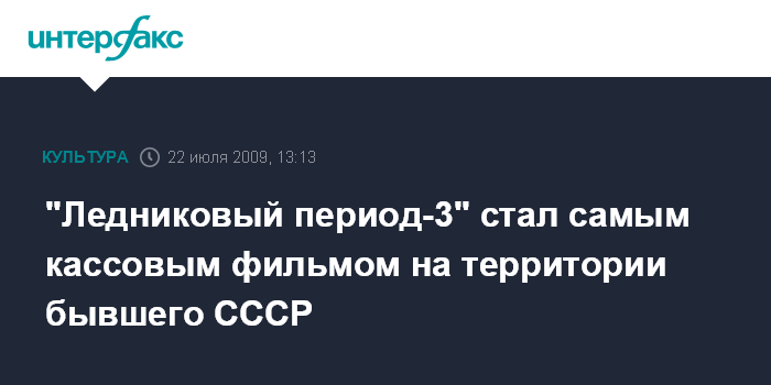 Москва. 22 июля. INTERFAX.RU - Компания "Двадцатый Век Фокс СНГ" и региональное отделение компании "Twentieth Century Fox International" в РФ и странах СНГ (исключая Украину) сообщают, что за первые 19 дней кинотеатрального проката общие кассовые сборы фильма "Ледниковый период-3: Эра динозавров" (Ice Age: Dawn of Dinosaurs) составили 1, 23 млрд руб. (при том, что картину посмотрели 7, 3 млн зрителей). Таким образом, по состоянию на вечер 19 июля "Ледниковый период-3" стал самым кассовым фильмом в современной киноиндустрии на территории бывшего СССР, опередив прежних рекордсменов - фильмы "Ирония судьбы. Продолжение" (1,2 млрд руб.) и "Мадагаскар-2" (1,1 млрд рублей).