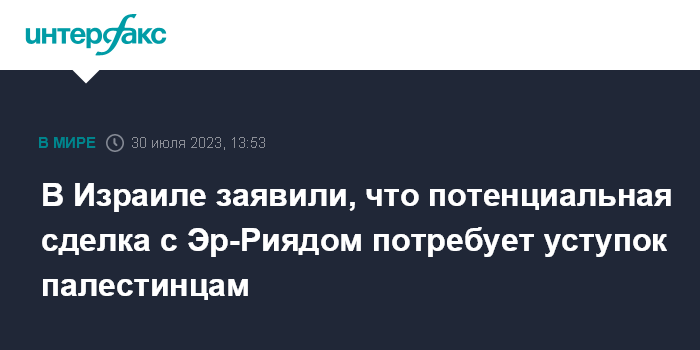 Москва. 30 июля. INTERFAX.RU - Потенциальная сделка о нормализации отношений с Саудовской Аравией потребует от Израиля больших уступок палестинцам, на которые вряд ли согласится правящая коалиция правых партий, пишет газета Times of Israel.
