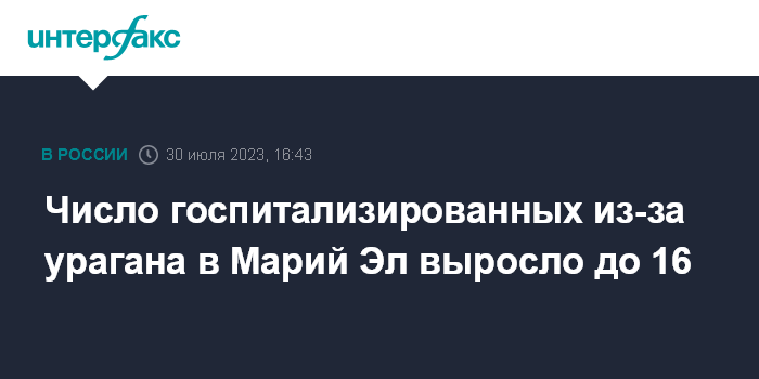 Москва. 30 июля. INTERFAX.RU - После урагана в субботу в Марий Эл были госпитализированы 16 человек, в том числе двое детей, сообщает пресс-служба ГУ МЧС России.