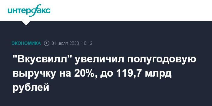 Москва. 31 июля. INTERFAX.RU - В первом полугодии 2023 года выручка ритейлера "Вкусвилл" увеличилась на 20% в годовом измерении и составила 119,7 млрд рублей, сообщила компания.