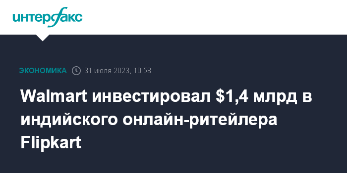 Москва. 31 июля. INTERFAX.RU - Американский ритейлер Walmart Inc. выкупил долю хедж-фонда Tiger Global в индийской платформе электронной торговли Flipkart за $1,4 млрд, пишет The Wall Street Journal со ссылкой на письмо фонда в адрес инвесторов.