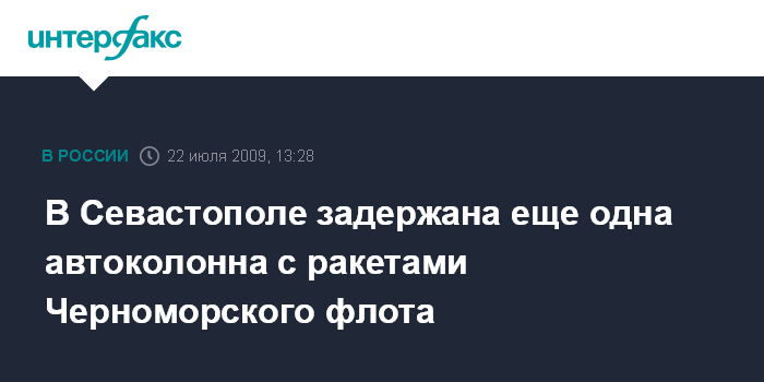 Севастополь. 22 июля. INTERFAX.RU - Два автомобиля Черноморского флота, перевозившие крылатые ракеты морского базирования "Малахит", были задержаны в минувший вторник сотрудниками украинской Госавтоинспекции в Севастополе, сообщили "Интерфаксу" в среду в штабе Черноморского флота.