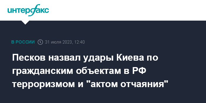 Москва. 31 июля. INTERFAX.RU - Каких-либо успехов у Киева в военных действиях нет, а его удары по гражданским объектам на территории России - это акт отчаяния, заявили в Кремле.