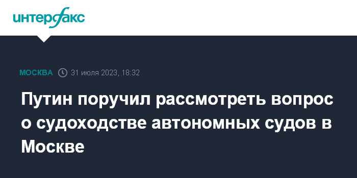 Москва. 31 июля. INTERFAX.RU - Президент России Владимир Путин поручил правительству РФ и властям Москвы проработать вопрос о наделении города правом диспетчерского регулирования движения судов в границах Москвы, а также проработать вопрос об организации судоходства автономных судов по рекам столицы.