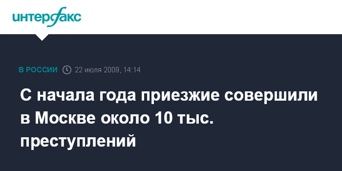 Москва. 22 июля. INTERFAX.RU - Количество преступлений, совершенных иногородними в столице за 6 месяцев 2009 г., выросло на 16% по сравнению с аналогичным периодом 2008 года, сообщил заместитель начальника милиции общественной безопасности ГУВД Москвы Григорий Краснов на пресс-конференции в среду.