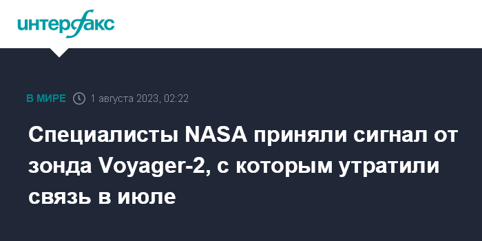 Москва. 1 августа. INTERFAX.RU - Специалисты Национального управления США по аэронавтике и исследованию космического пространства (NASA) получили сигнал от межпланетного зонда Voyager-2, связь с которым была потеряна в июле.