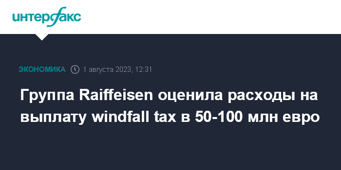 Москва. 1 августа. INTERFAX.RU - Австрийская банковская группа Raiffeisen Bank International (RBI), владеющая российским Райффайзенбанком, оценила расходы на выплату налога на сверхприбыль в сумму до 100 млн евро.