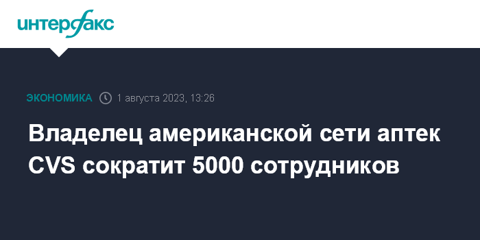 Москва. 1 августа. INTERFAX.RU - Американская CVS Health Corp., которой принадлежат сеть аптек и страховщик Aetna Inc., увольняет около 5 тысяч человек ради сокращения издержек, пишет The Wall Street Journal со ссылкой на сообщение компании для сотрудников.