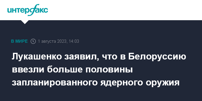 Москва. 1 августа. INTERFAX.RU - Президент Белоруссии Александр Лукашенко заявил, что "уже более половины ядерного оружия, которое планировалось разместить, завезено и рассредоточено по стране", но выразил надежду, что будет возможно избежать его применения. Его цитирует "БелТА".
