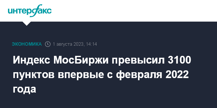 Москва. 1 августа. INTERFAX.RU - Индекс МосБиржи, один из основных российских фондовых индикаторов, днем во вторник превысил отметку 3100 пунктов, обновив максимум с февраля 2022 года на фоне ослабления рубля и дорогой нефти.