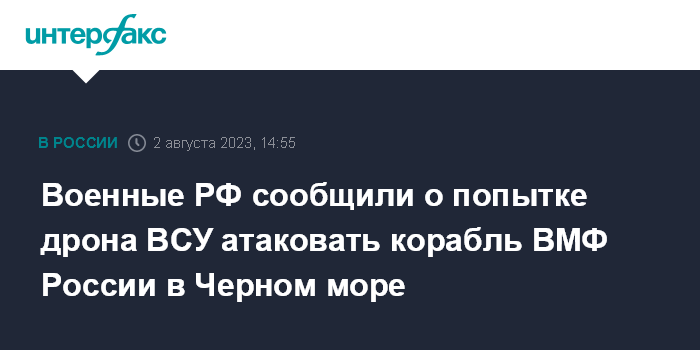 Москва. 2 августа. INTERFAX.RU - Вооруженные силы Украины (ВСУ) попытались атаковать морским беспилотным катером российский военный корабль, сопровождавший гражданский транспорт в юго-западной части Черного моря, заявил официальный представитель Минобороны РФ Игорь Конашенков.