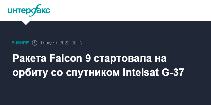 Москва. 3 августа. INTERFAX.RU - Ракета Falcon 9 стартовала на орбиту с телекоммуникационным спутником Intelsat G-37, сообщила компания-разработчик носителя SpaceX.