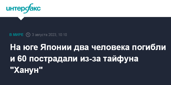 Москва. 3 августа. INTERFAX.RU - Обрушившийся на японский остров Окинава тайфун "Ханун" унес жизни двух человек, 60 жителей получили травмы, сообщает The Guardian.