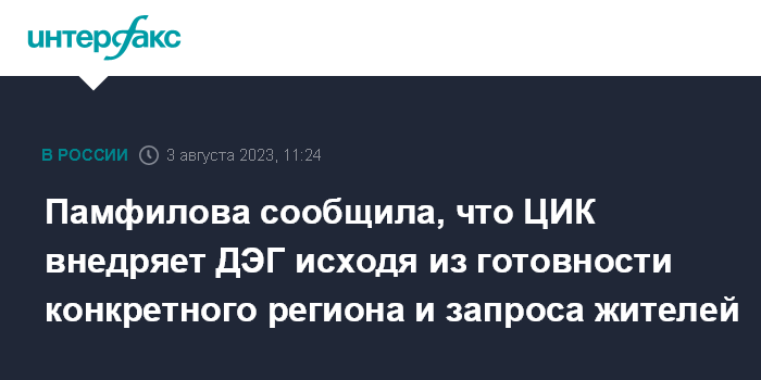 "Мы никому навязывать это не будем. Хотя мы готовы в масштабах страны это проводить, но мы решили не рисковать. Потому что развитие ДЭГ идет абсолютно прямопропорционально степени защиты безопасности и развитию уровня доверия. На выборах президента 2024 года ДЭГ будут применять только те регионы, у которых уже есть опыт", - сказала Памфилова.