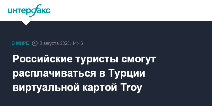 Москва. 3 августа. INTERFAX.RU - Российские туристы смогут расплачиваться в Турции виртуальной картой турецкой платежной системы Troy, соответствующее приложение появилось в магазинах AppStore и GooglePlay, сообщает в четверг газета "Коммерсантъ".