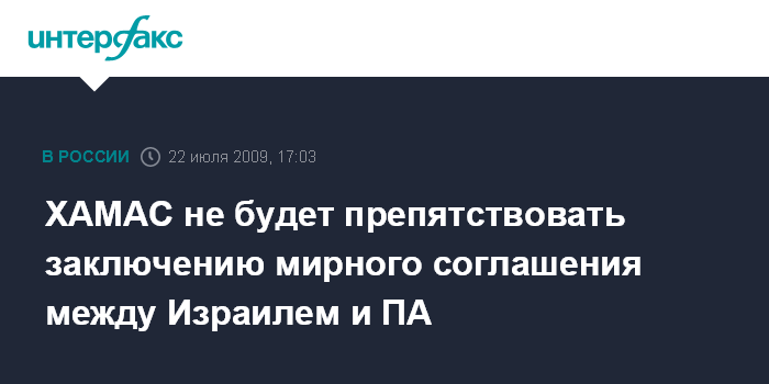 Иерусалим. 22 июля. INTERFAX.RU - Глава политического бюро движения ХАМАС Халед Машааль заявил высокопоставленному российскому дипломату, что его организация не будет препятствовать заключению мирного соглашения между Палестинской национальной администрацией (ПНА) и Израилем, сообщает Haaretz.