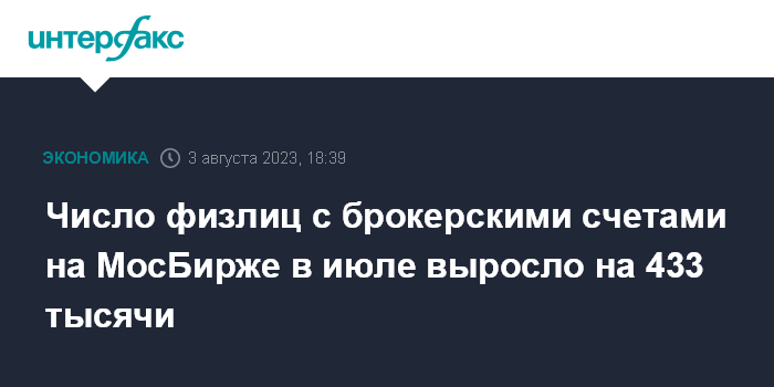 Москва. 3 августа. INTERFAX.RU - Количество физлиц, имеющих брокерские счета на Московской бирже, в июле 2023 года увеличилось на 433 тысячи, до 26,39 млн человек, сообщается в пресс-релизе биржи.