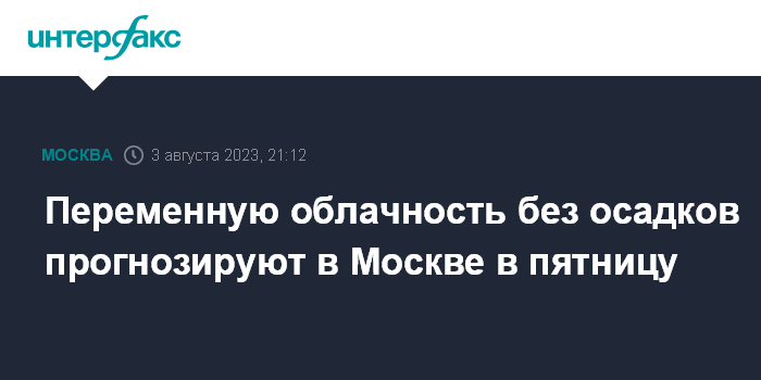 Москва. 3 августа. INTERFAX.RU - Синоптики прогнозируют переменную облачность, преимущественно без осадков, в столице в пятницу, сообщается на сайте Гидрометцентра России.
