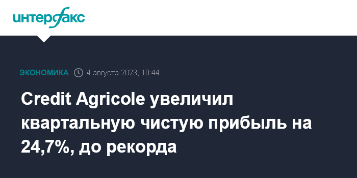 Москва. 4 августа. INTERFAX.RU - Во II квартале 2023 года французский банк Credit Agricole зафиксировал рост чистой прибыли и выручки, при этом чистая прибыль обновила квартальный и полугодовой рекорды.