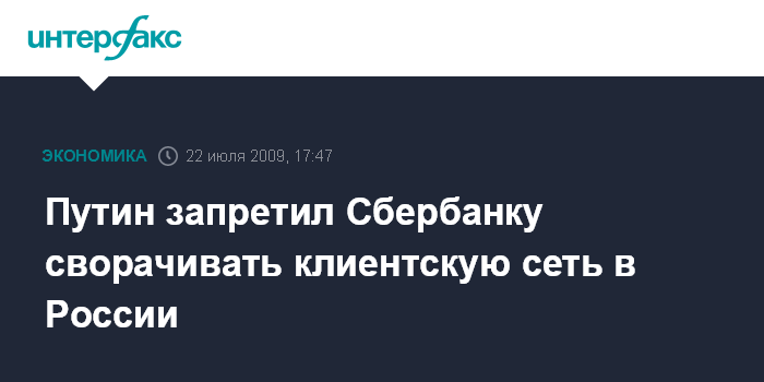Москва. 22 июля. INTERFAX.RU - Премьер РФ Владимир Путин потребовал от Сбербанка не сворачивать клиентскую сеть по России, которая во многом выполняет социальные функции.