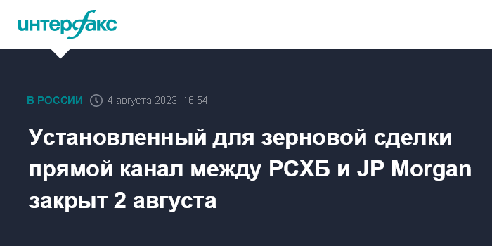 Установленный для зерновой сделки прямой канал между РСХБ и JP Morgan закрыт 2 августа