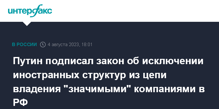 Москва. 4 августа. INTERFAX.RU - Президент РФ Владимир Путин подписал закон, позволяющий российским бенефициарам экономически значимых отечественных организаций (ЭЗО) через суд получать напрямую дивиденды от них, а также акции и доли в прямое владение, обойдя иностранные структуры из "недружественных" юрисдикций.