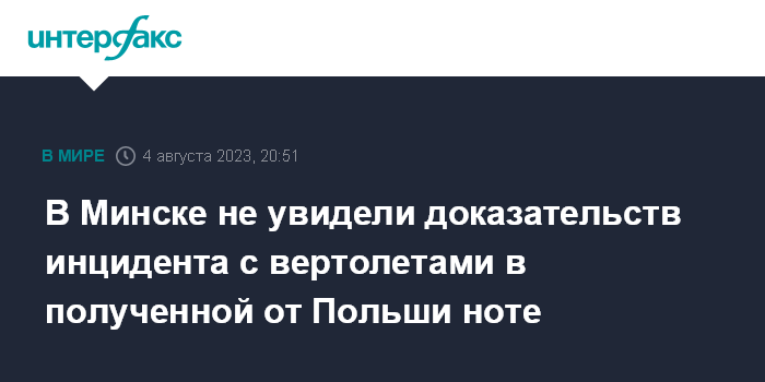 Москва. 4 августа. INTERFAX.RU - Министерство иностранных дел Белоруссии заявляет об отсутствии доказательств инцидента с белорусскими вертолетами в переданной Польшей ноте.
