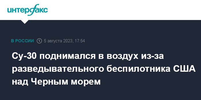 Москва. 5 августа. INTERFAX.RU - Российские военные подняли в воздух истребитель Су-30 из-за разведывательного беспилотника Reaper ВВС США над Черным морем, сообщил в субботу Национальный центр управления обороной РФ.
