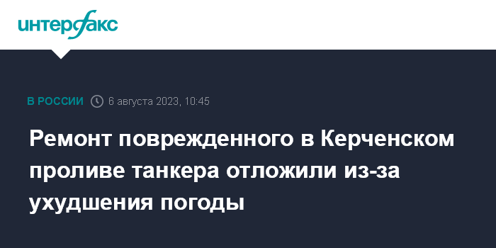 Москва. 6 августа. INTERFAX.RU - Росморречфлот принял решение прекратить ремонтные работы на поврежденном на подходе к Керченскому проливу танкере "Сиг" до улучшения погодных условий, сообщает пресс-служба ведомства.
