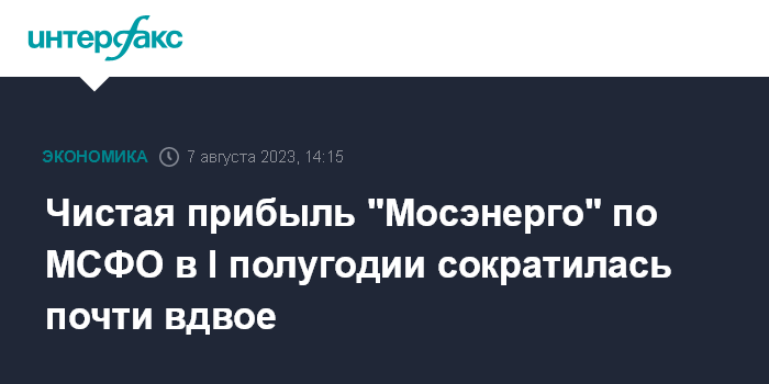 Москва. 7 августа. INTERFAX.RU - Чистая прибыль ПАО "Мосэнерго" по МСФО в I полугодии 2023 г. сократилась на 44,1% по сравнению с аналогичным периодом прошлого года, до 6,88 млрд руб.