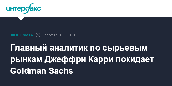 Москва. 7 августа. INTERFAX.RU - Известный аналитик по сырьевым рынкам Джеффри Карри покидает Goldman Sachs Group Inc., в котором он проработал более 27 лет, сообщает Bloomberg со ссылкой на информацию, распространенную среди сотрудников банка.