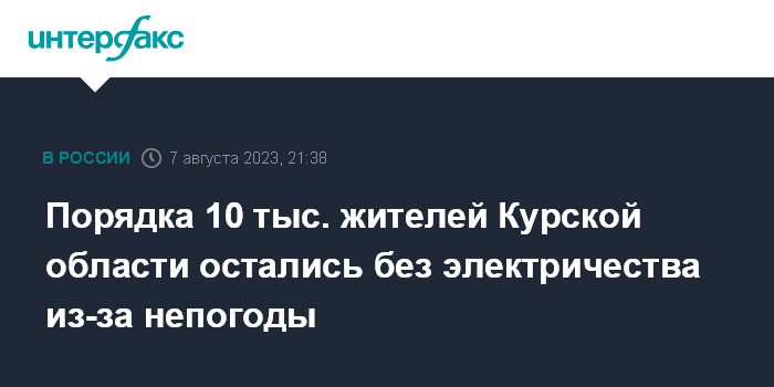 Москва. 7 августа. INTERFAX.RU - Гроза и сильный ветер стали причиной отключения энергоснабжения у десятка тысяч жителей Курской области, сообщила пресс-служба обладминистрации.