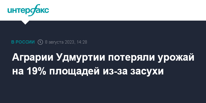 Москва. 8 августа. INTERFAX.RU - В Удмуртии 24 из 25 районов попали в зону засухи и потеряли урожай сельхозкультур на 19% площадей, сообщила пресс-служба Минсельхоза республики во вторник.