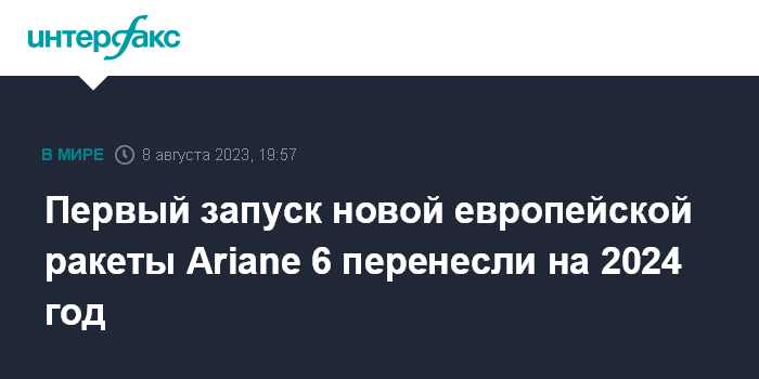 "ESA (Европейское космическое агентство) ArianeGroup, Arianespace и CNES (французское космическое агентство - Национальный центр космических исследований) подтверждают, что первый запуск Ariane 6 теперь планируется на 2024 год", - написал Израэль на своей странице в соцсетях во вторник.