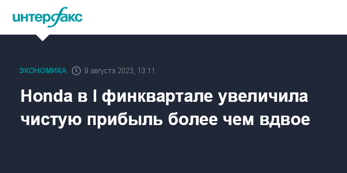 Москва. 9 августа. INTERFAX.RU - Японская Honda Motor Co. в первом финквартале увеличила чистую прибыль в 2,4 раза за счет резкого роста доходов автомобильного бизнеса.