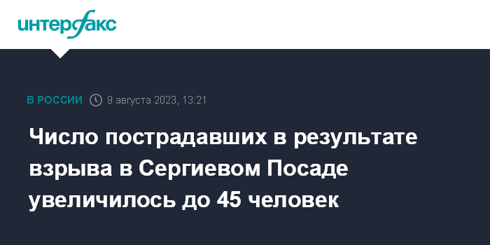 Москва. 9 августа. INTERFAX.RU - До 45 человек увеличилось число пострадавших в результате взрыва на заводе в Сергиевом Посаде, шестеро находятся в реанимации, сообщили в пресс-службе администрации муниципалитета в среду.