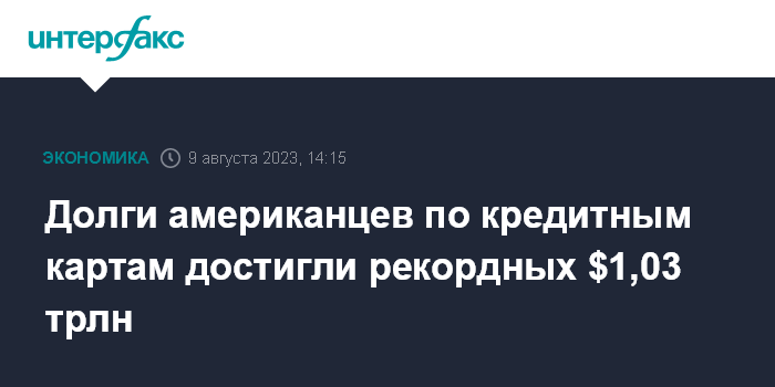 Москва. 9 августа. INTERFAX.RU - Совокупная задолженность граждан США по кредитным картам во втором квартале 2023 года увеличилась на 16,2% в годовом выражении и достигла рекордной отметки в $1,03 трлн, говорится в отчете Федерального резервного банка Нью-Йорка.