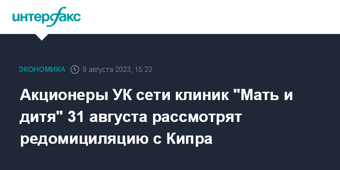 Акционеры УК сети клиник "Мать и дитя" 31 августа рассмотрят редомициляцию с Кипра