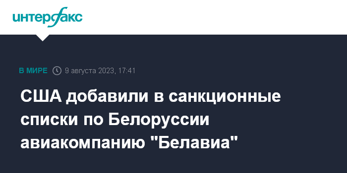 Москва. 9 августа. INTERFAX.RU - Авиакомпания "Белавиа", "Минский завод гражданской авиации №407" и еще три структуры вошли в санкционные списки США по Белоруссии, говорится в пресс-релизе американского Минфина.