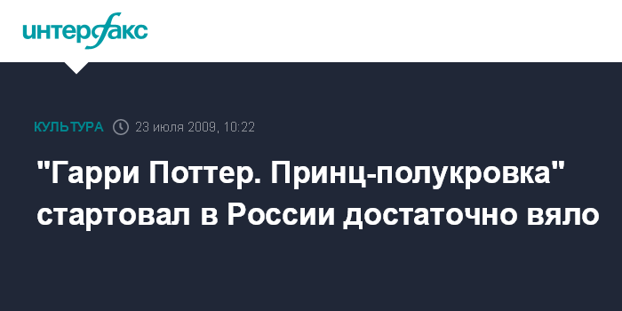 Москва. 23 июля. INTERFAX.RU - Лента "Гарри Поттер. Принц-полукровка", вышедшая на российские экраны, за первый уикенд собрала 287 млн руб., сообщает дистрибьютор фильма "Warner Bros.Pictures", Россия. Фильм идет в нашей стране на 915-ти экранах. Отметим, что старт шестого фильма про Гарри Поттера оказался более успешным, чем его пятой серии, которая по результатам первого уикенда собрала 253 млн руб. (правда, тогда фильм шел всего на 534 экранах).