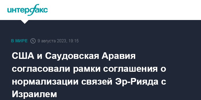 Москва. 9 августа. INTERFAX.RU - США и Саудовская Аравия достигли договоренностей об основах будущего соглашения о нормализации отношений королевства и Израиля, сообщает в среду The Wall Street Journal (WSJ) со ссылкой на неназванных представителей американских властей.