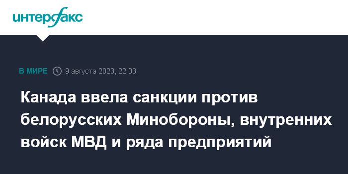 Москва. 9 августа. INTERFAX.RU - Канада расширила санкции против Белоруссии, сообщило в среду министерство иностранных дел и международной торговли Канады.