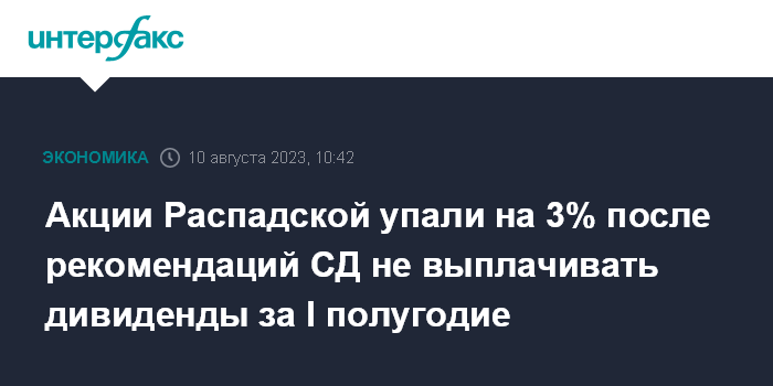 Москва. 10 августа. INTERFAX.RU - Акции "Распадской" утром в четверг на Мосбирже скорректировались вниз на 3% после известий, что совет директоров компании не рекомендовал выплачивать дивиденды за I полугодие 2023 года из-за сокращения чистой прибыли вдвое.