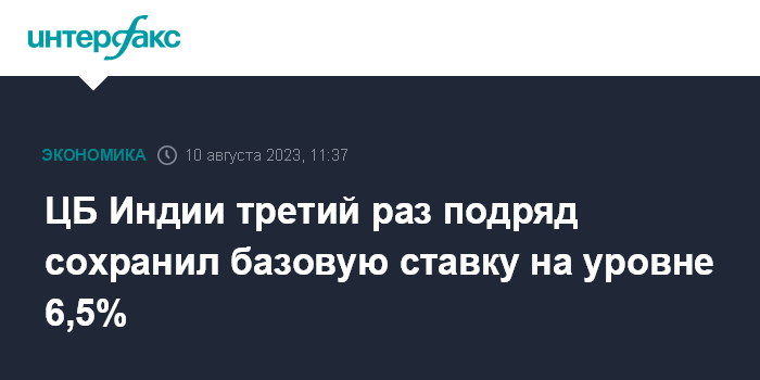 Москва. 10 августа. INTERFAX.RU - Резервный банк Индии (RBI) сохранил неизменной ключевую процентную ставку по итогам третьего заседания подряд, несмотря на ускорение инфляции в стране. Ставка по операциям РЕПО в четверг оставлена уровне 6,5%, говорится в заявлении RBI.