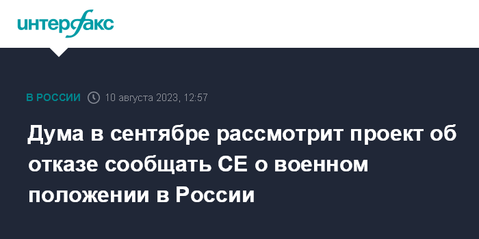Москва. 10 августа. INTERFAX.RU - Госдума рассмотрит в сентябре законопроект об исключении из действующих законов о чрезвычайном и о военном положении нормы об информировании генерального секретаря Совета Европы о введении либо прекращении такого положения на территории России, сообщили в пресс-службе палаты.