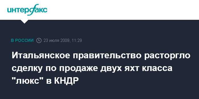 Москва. 23 июля. INTERFAX.RU - Италия заблокировала продажу двух яхт класса "люкс" в Северную Корею из-за опасений, что они достанутся руководителю страны Ким Чен Иру, говорится в сообщении, размещенном в четверг на веб-сайте британского издания "Файнэншл таймс".