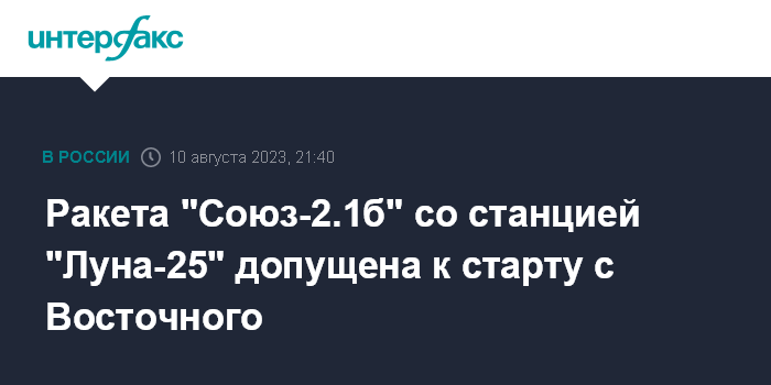 Москва. 10 августа. INTERFAX.RU - Госкомиссия одобрила заправку топливом и старт ракеты-носителя "Союз-2.1б" с автоматической станцией "Луна-25" в пятницу с космодрома Восточный, сообщили в "Роскосмосе".