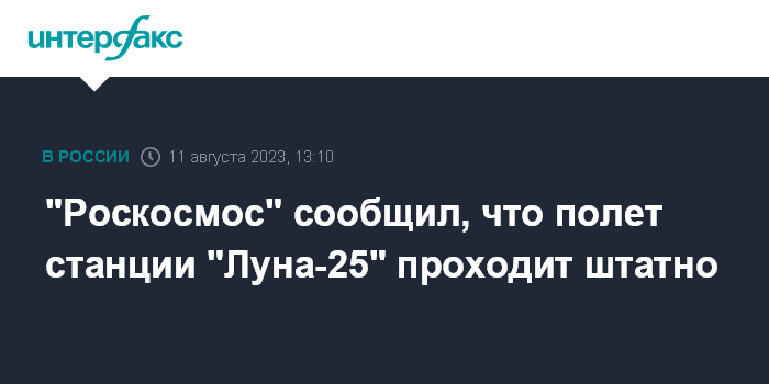 Москва. 11 августа. INTERFAX.RU - Бортовые системы автоматической межпланетной станции "Луна-25" в ходе полета работают штатно, связь с аппаратом устойчивая, сообщили в "Роскосмосе".