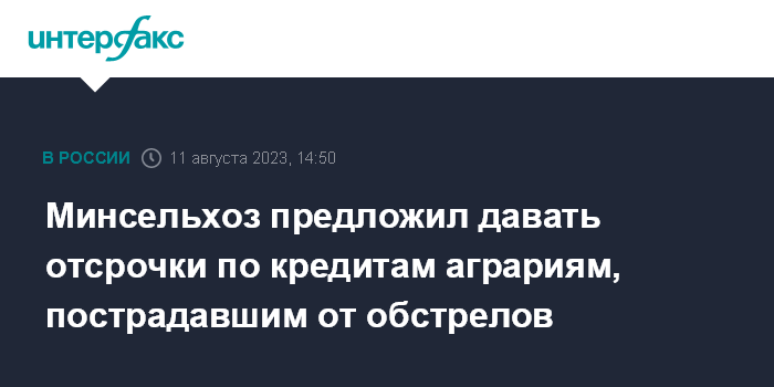 Москва. 11 августа. INTERFAX.RU - Аграрии приграничных регионов России, пострадавшие от обстрелов со стороны Украины, могут получить пролонгацию и/или отсрочку платежей по льготным кредитам. Проект соответствующего постановления правительства подготовил Минсельхоз. Документ размещен на сайте проектов нормативно-правовых актов.